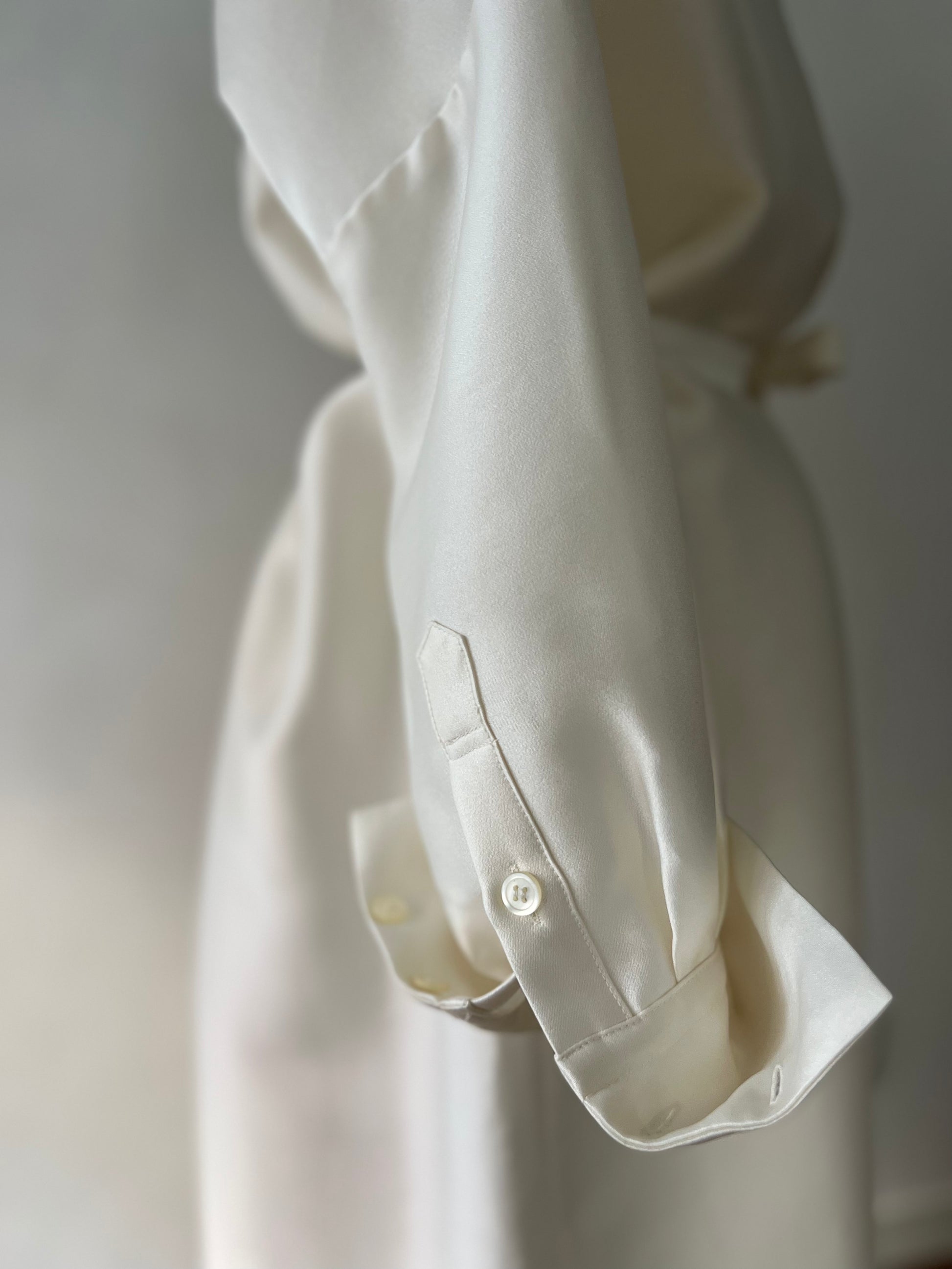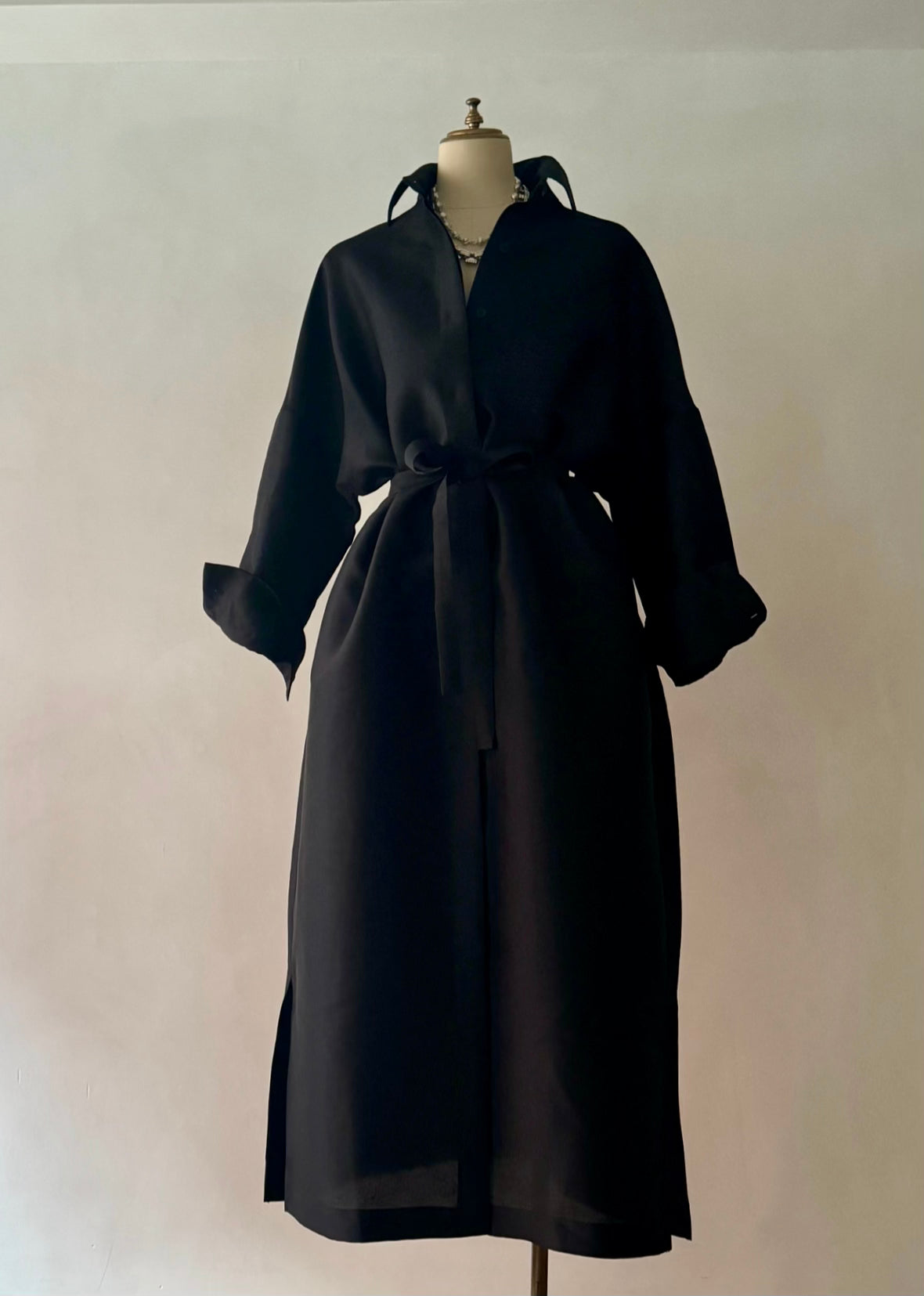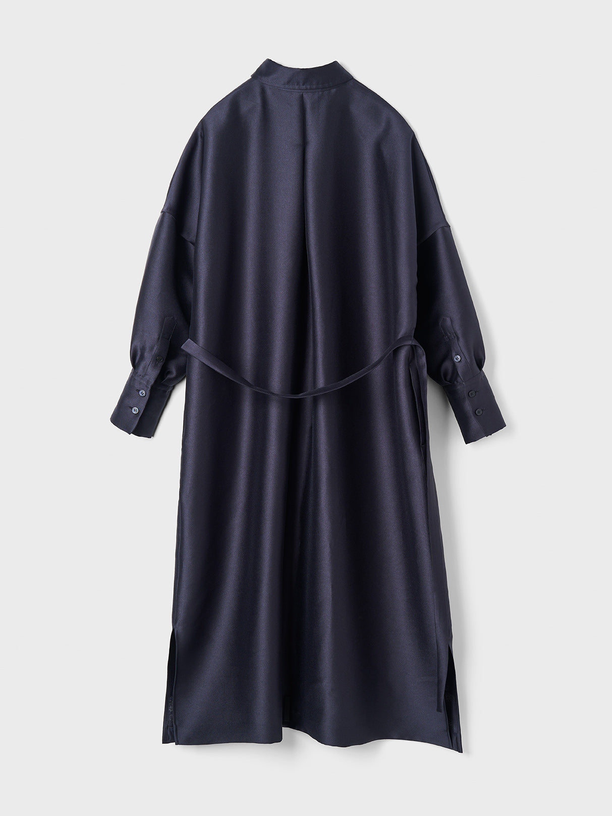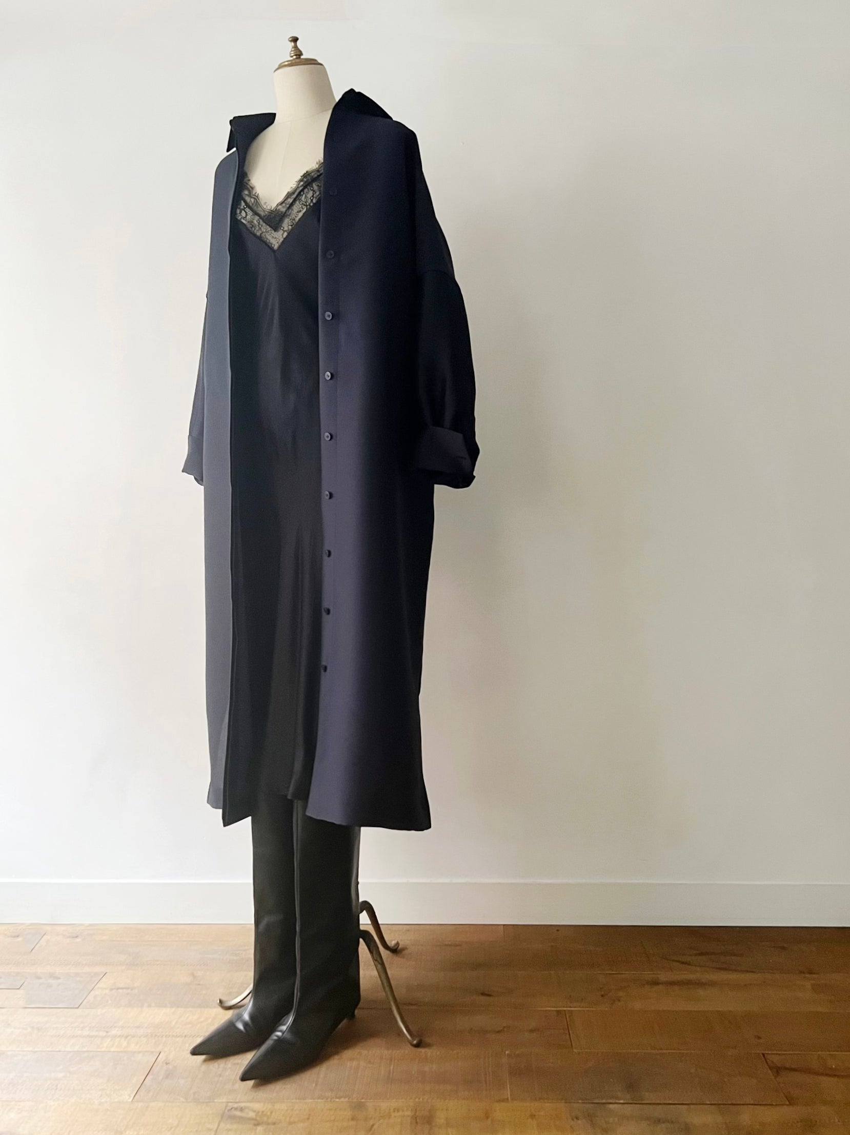 長めに仕立てたカフ、台襟は高く襟は小さく、 ふんわりとオーバーサイズで着るシャツドレスはエフォートレスでラグジュアリーな雰囲気が魅力です。