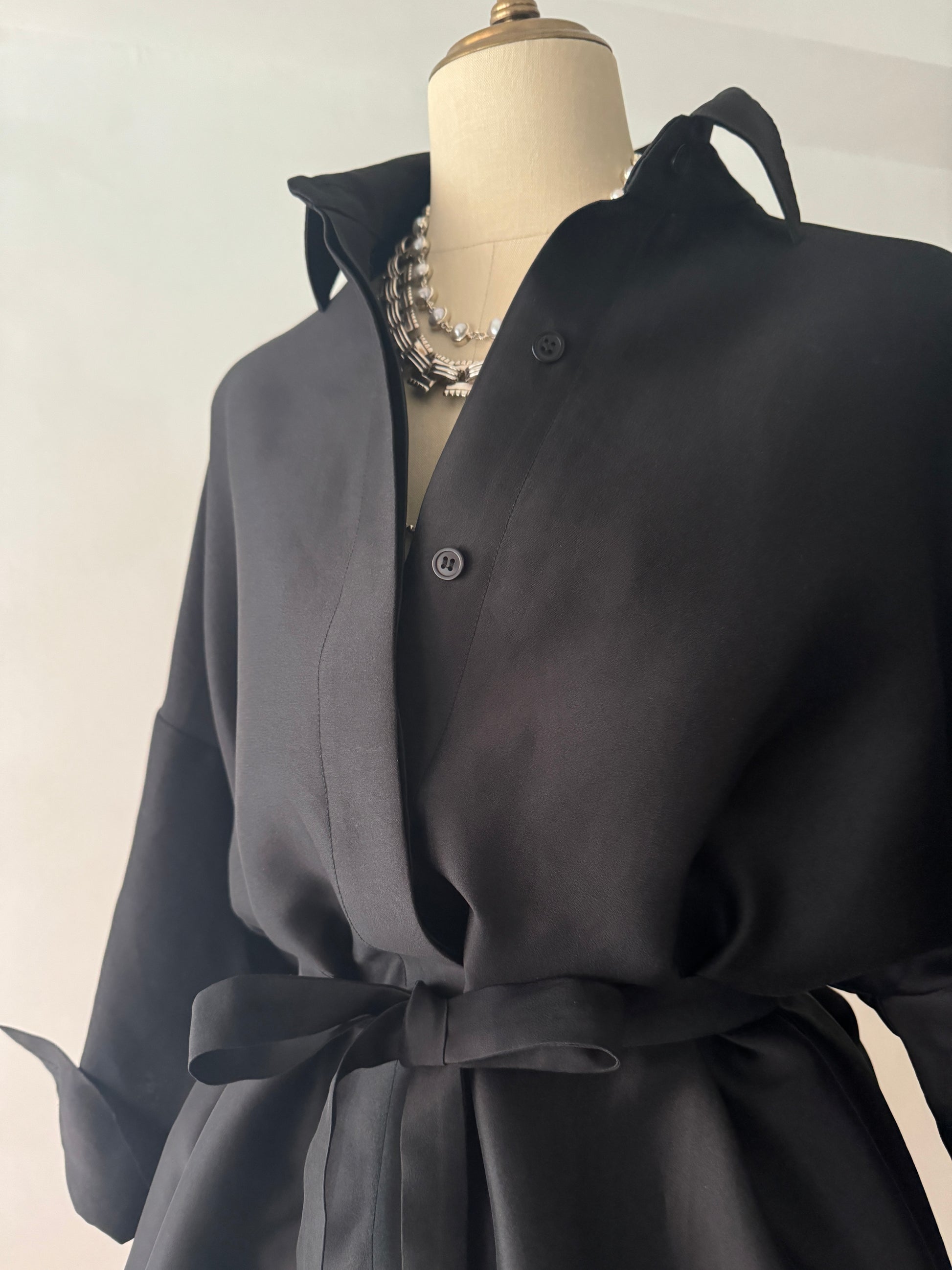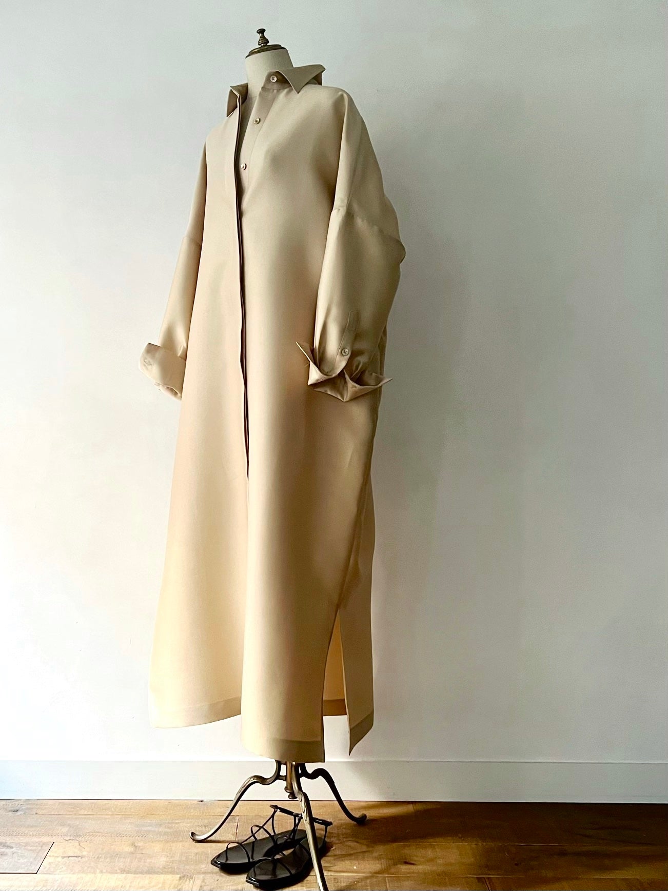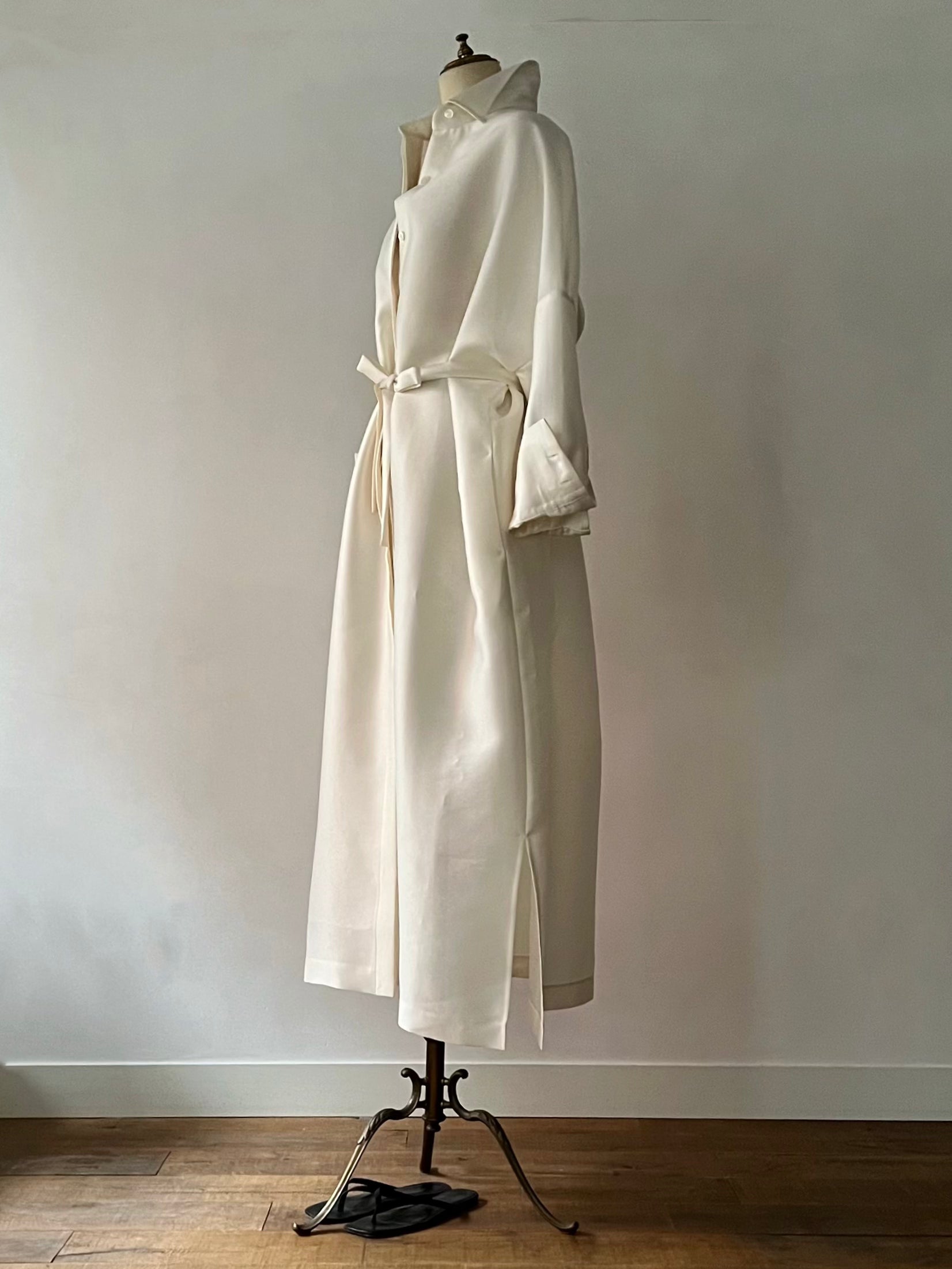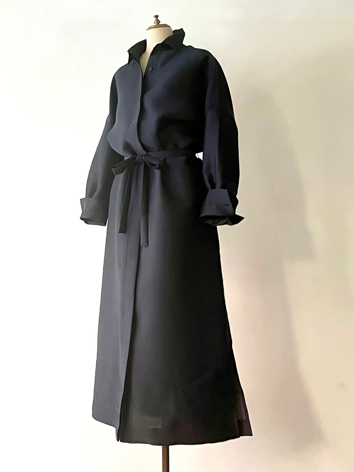 長めに仕立てたカフ、台襟は高く襟は小さく、 ふんわりとオーバーサイズで着るシャツドレスはエフォートレスでラグジュアリーな雰囲気が魅力です。