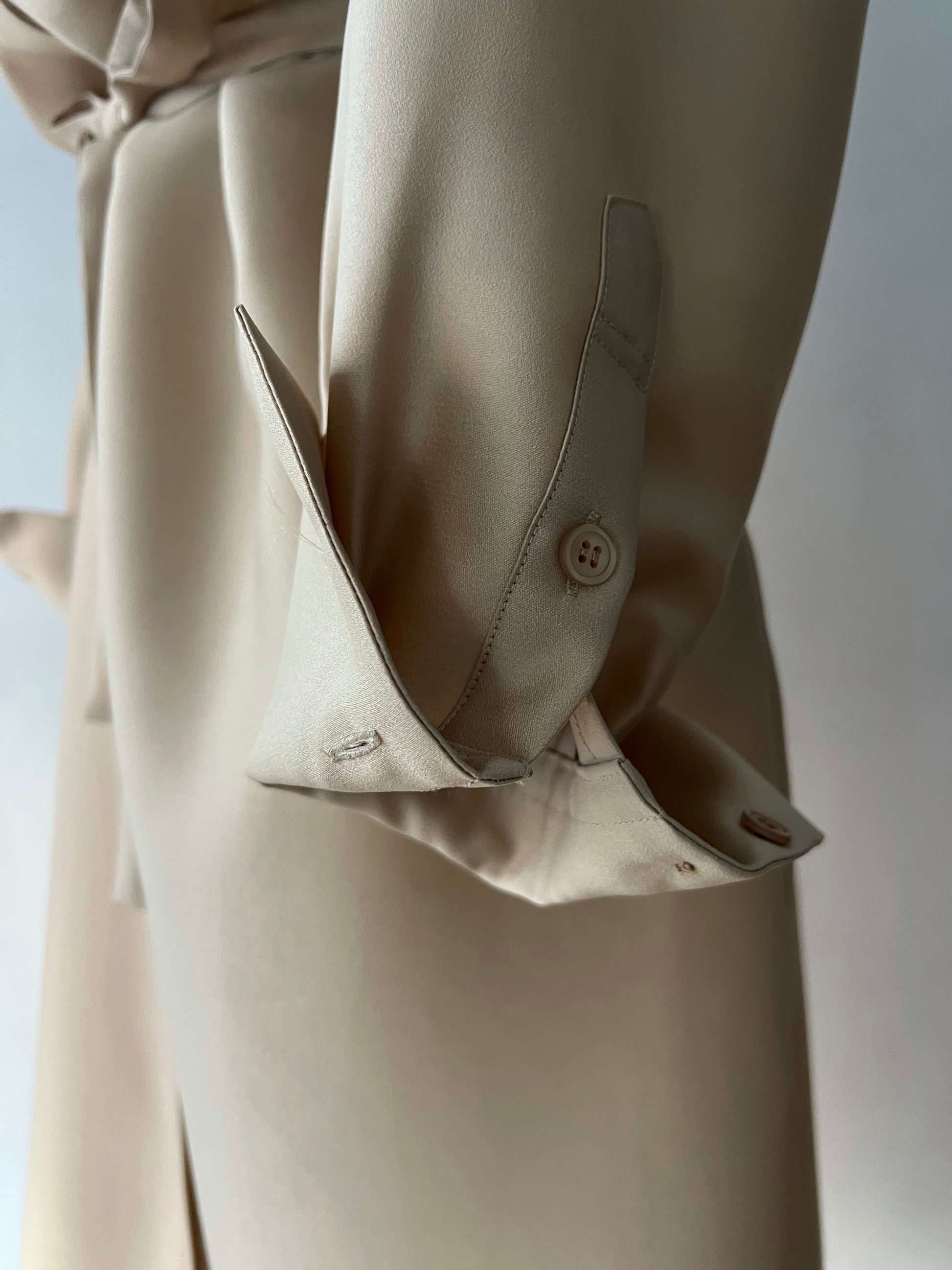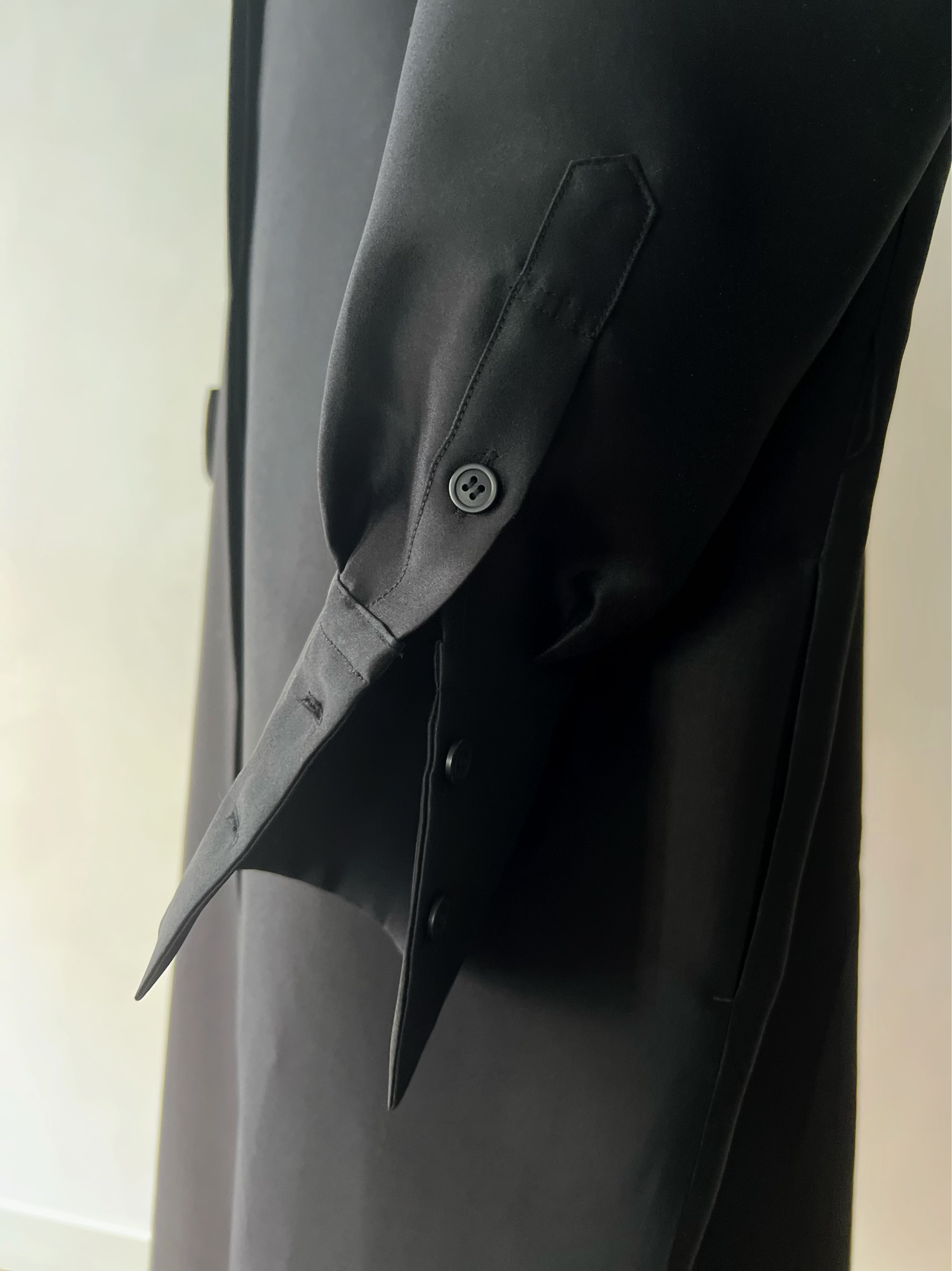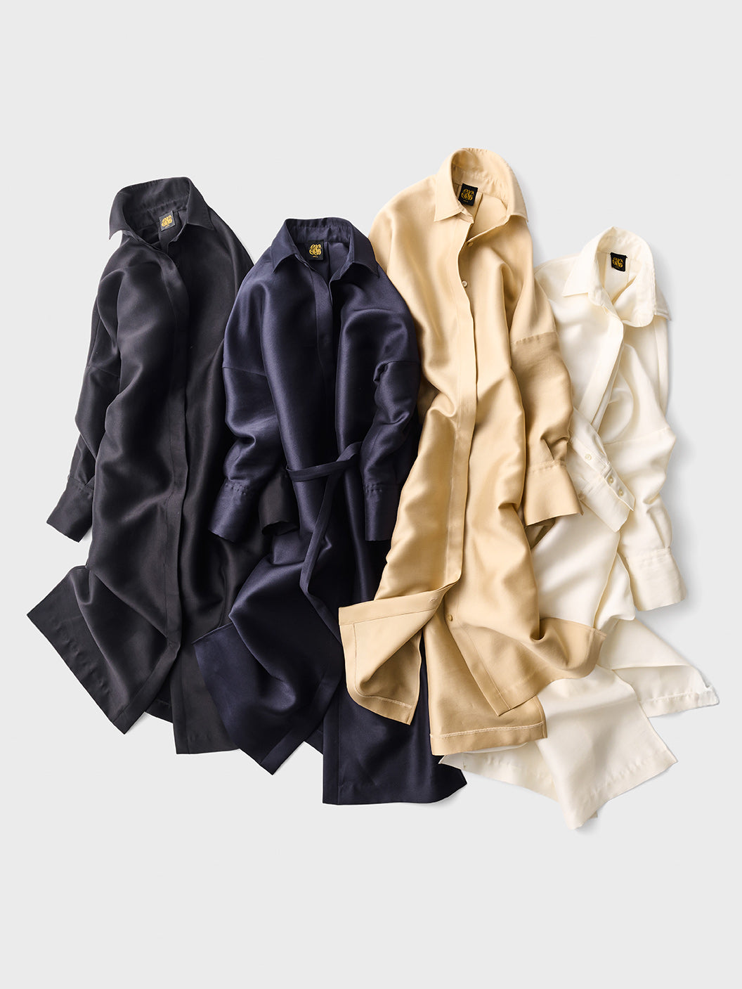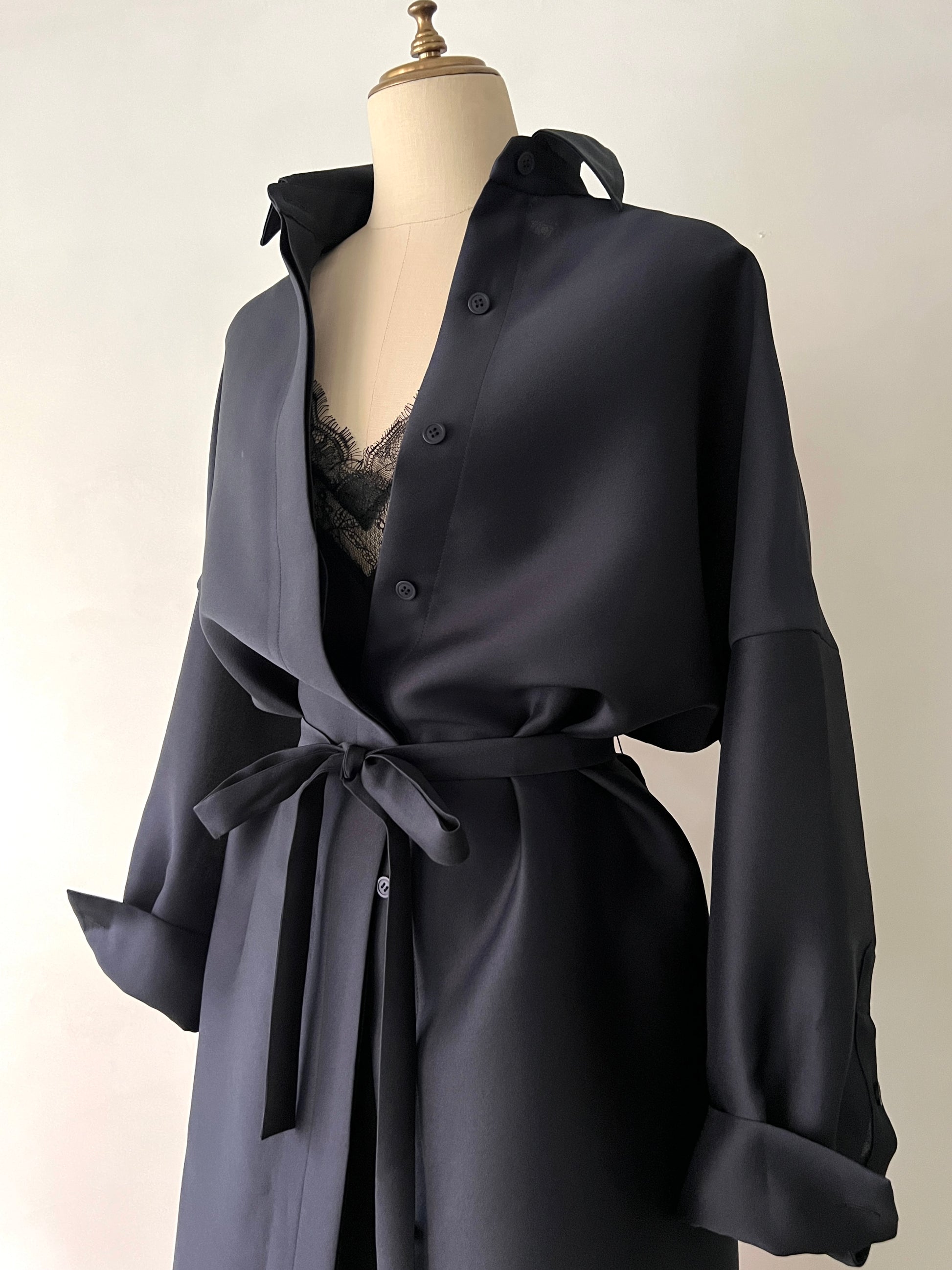 長めに仕立てたカフ、台襟は高く襟は小さく、 ふんわりとオーバーサイズで着るシャツドレスはエフォートレスでラグジュアリーな雰囲気が魅力です。