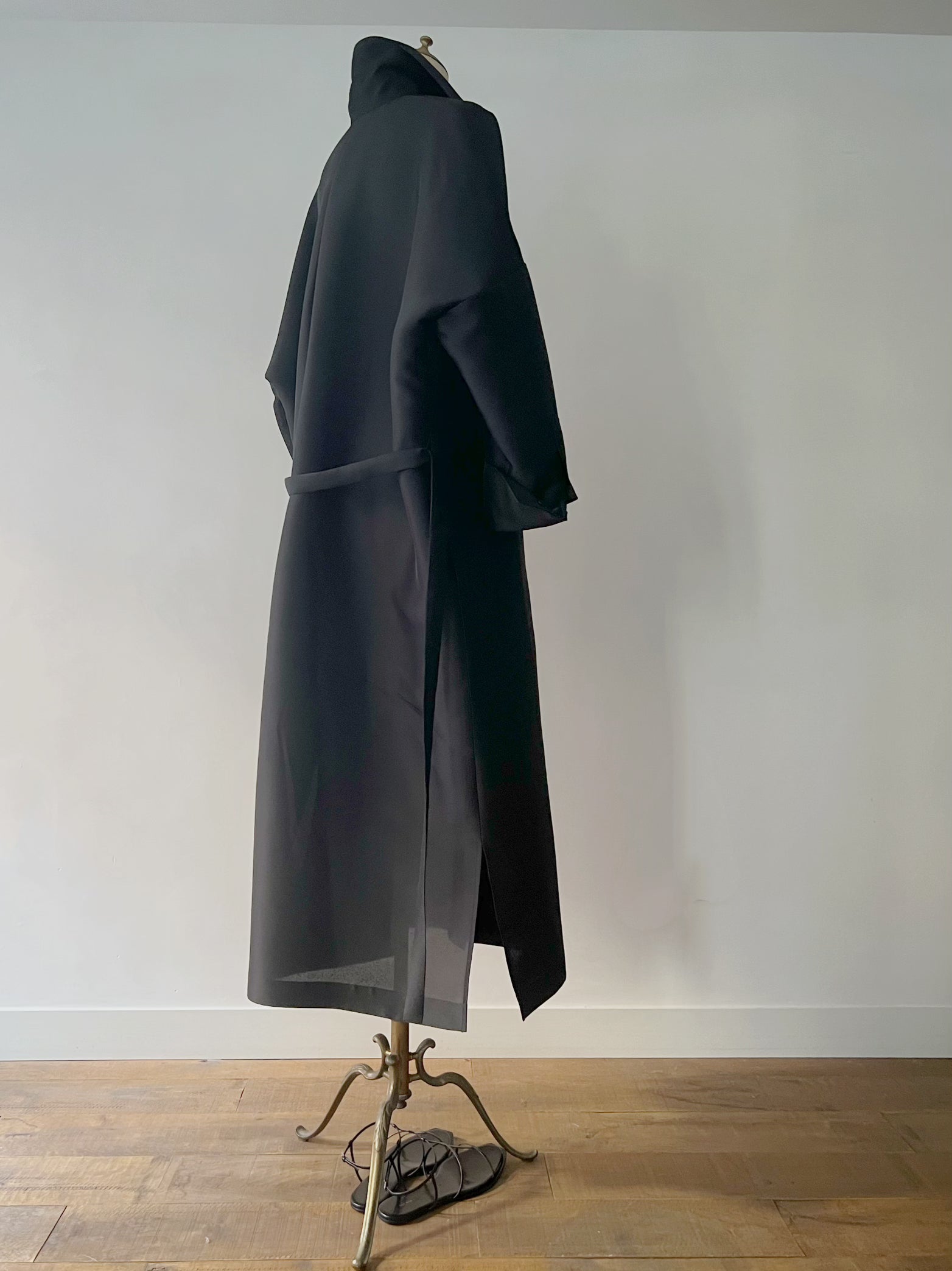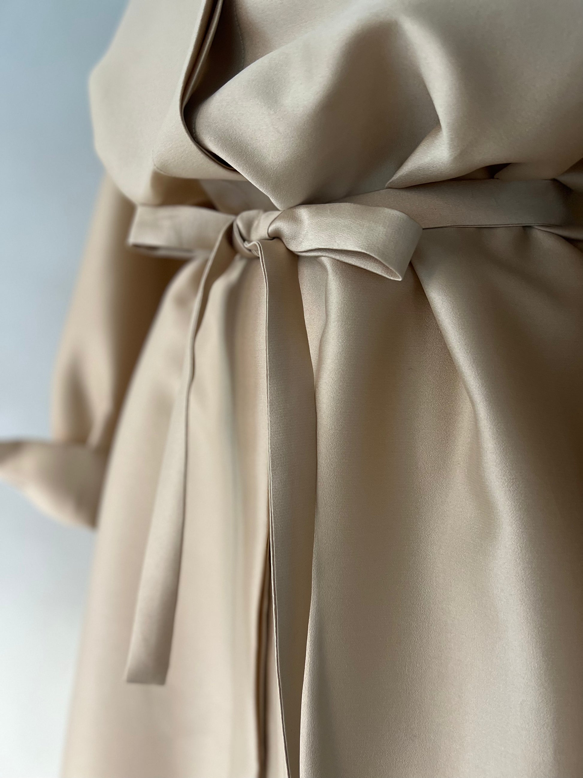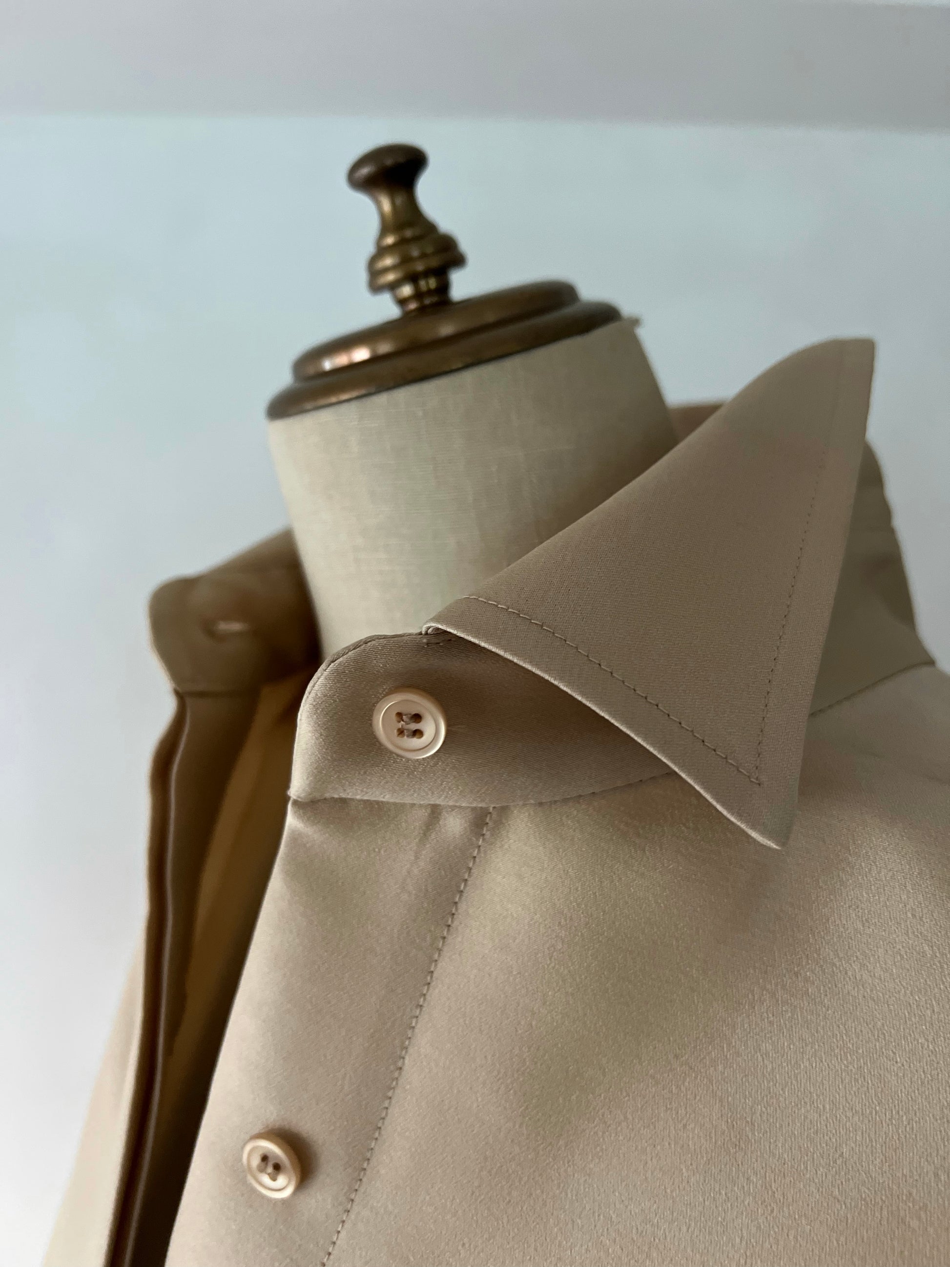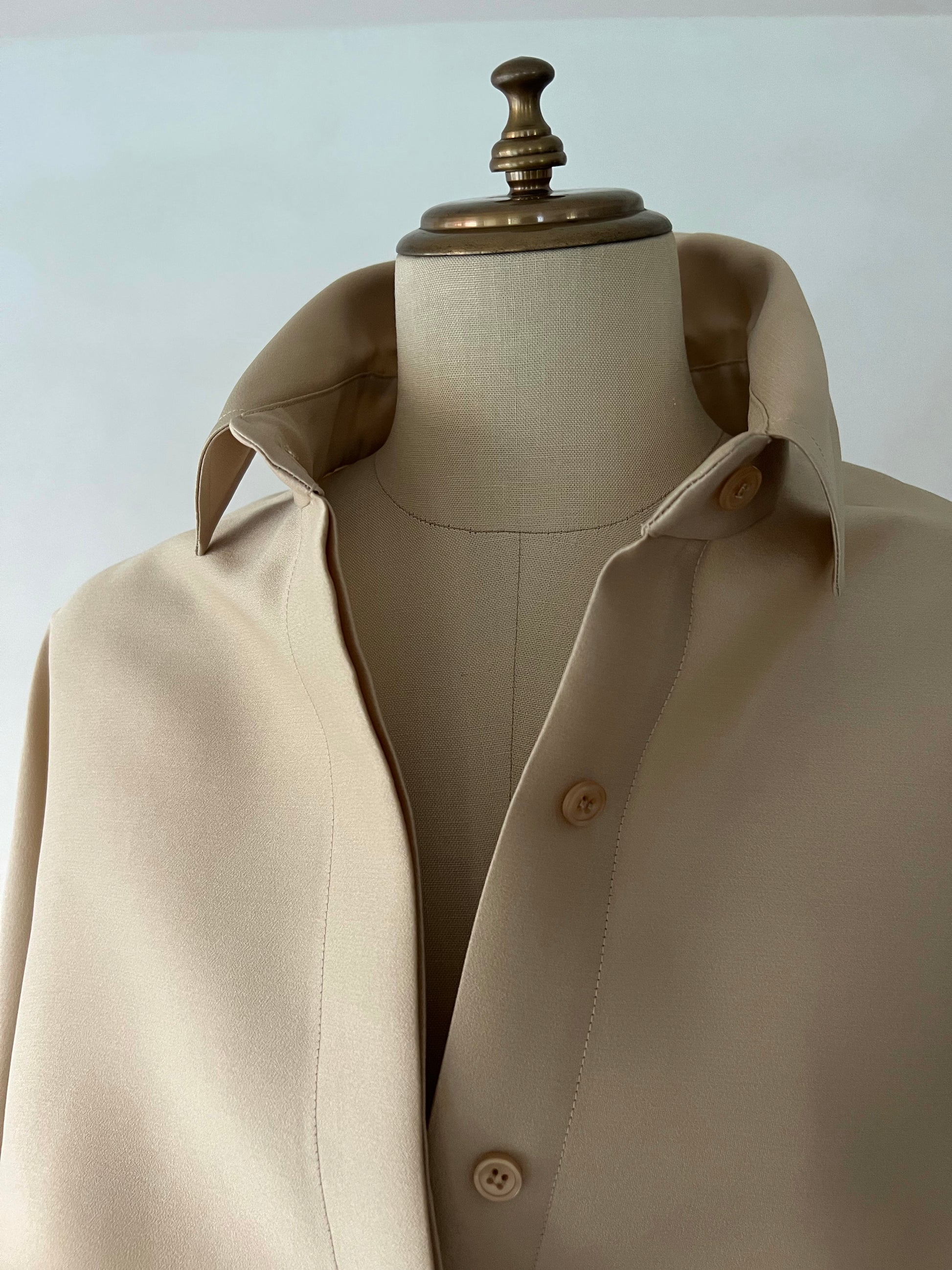 長めに仕立てたカフ、台襟は高く襟は小さく、 ふんわりとオーバーサイズで着るシャツドレスはエフォートレスでラグジュアリーな雰囲気が魅力です。
