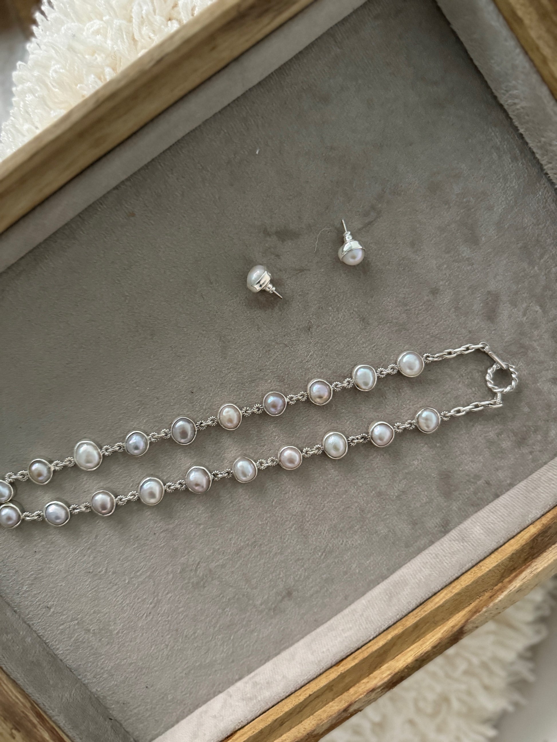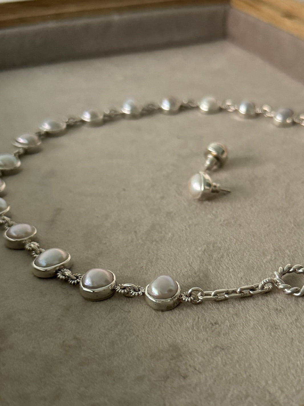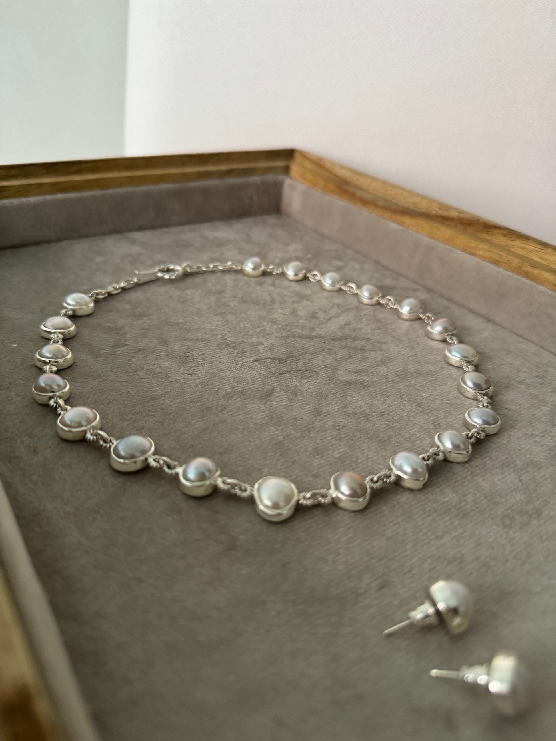 色も形も異なるバロックパールのひとつひとつに、それぞれシルバーのケースを設え、
